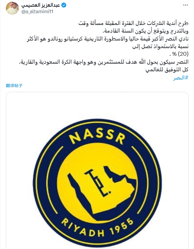 利雅得勝利目前是最有價(jià)值的俱樂(lè)部,羅納爾多目前的股權(quán)比率最高,達(dá)到20。利雅得勝利將成為投資者的焦點(diǎn),并成為沙特和亞洲足球的外墻。